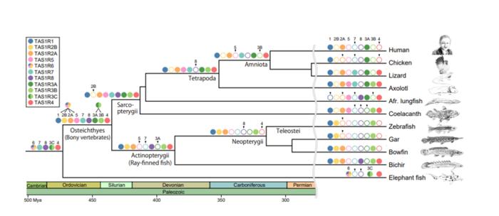 The findings also suggest that the first TAS1R gene appeared in jawed vertebrates around 615–473 million years ago. The gene then underwent several duplications to produce nine taste receptor genes (TAS1R1,2A, 2B, 3A, 3B, 4, 5, 7, and 8) in the common ancestor of bony vertebrates. Over time, some of these genes were lost in different lineages, with mammals and teleosts retaining only three TAS1Rs (TAS1R1, TAS1R2A, and TAS1R3A in mammals).