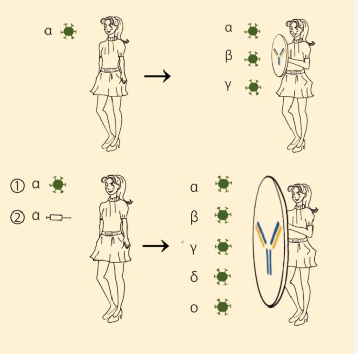 TOP: A PERSON IS INFECTED BY THE ALPHA VARIANT OF SARS-COV-2. WITHIN A FEW WEEKS, ANTIBODIES ARE MADE THAT PROTECT THE PERSON AGAINST THE ALPHA VARIANT AS WELL AS BETA AND GAMMA VARIANTS WHICH ARE VERY SIMILAR TO THE ALPHA VARIANT. BOTTOM: A PERSON WHO (1) HAS RECOVERED FROM COVID-19 AND WHO (2) HAS RECEIVED MRNA VACCINE WITH COMPONENTS OF THE ALPHA VARIANT DEVELOPS A STRONG IMMUNE RESPONSE WITHIN A FEW WEEKS. THE ANTIBODIES THAT ARE MADE IN THE BODY PROTECT AGAINST THE ALPHA VARIANT, THE CLOSELY RELATED BETA AND GAMMA VARIANTS AS WELL AS THE MORE DISTANTLY RELATED DELTA AND OMICRON VARIANTS. PEOPLE WHO HAVE RECOVERED FROM COVID-19 AND THEN RECEIVED THE MRNA VACCINE ARE ALSO PROTECTED AGAINST NEW VARIANTS OF SARS-COV-2. ILL: GERDA KAYNOVA