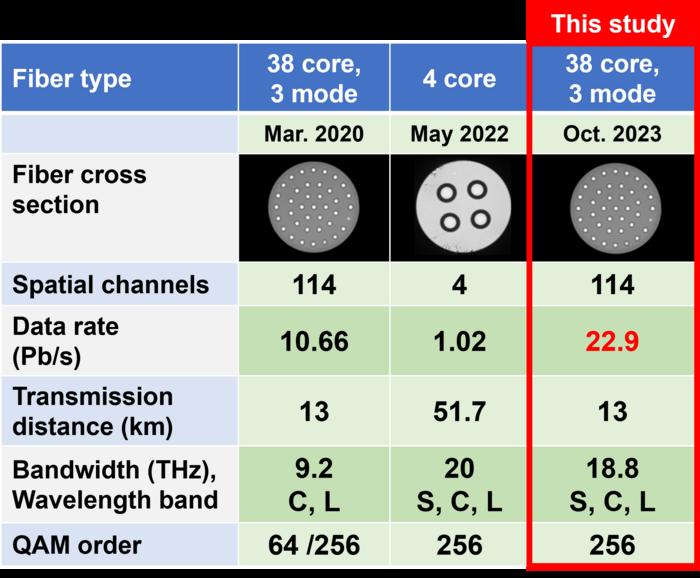 The measured transmission capacity for each core ranged from ~0.3 to 0.7 petabits per second leading to a total transmission capacity of 22.9 petabits per second. The achieved data-rate includes an overhead for an implemented forward-error correction code with the demonstration showing up to 24.7 Pb/s can be achieved with better optimized coding. This is more than 1,000 times the data-rate of currently deployed optical fiber communication systems.