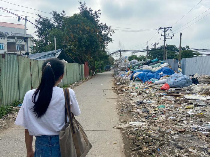 ABOUT HALF OF EUROPE’S PLASTIC WASTE IS EXPORTED TO SEVERAL COUNTRIES IN THE GLOBAL SOUTH, INCLUDING VIETNAM. A UTRECHT UNIVERSITY RESEARCH TEAM VENTURED TO MINH KHAI CRAFT VILLAGE, THE LARGEST RECYCLING HUB IN VIETNAM, TO FOLLOW THE RECYCLING PATH. HERE A WOMAN IS PICTURED WALKING THROUGH THE VILLAGE'S STREETS.