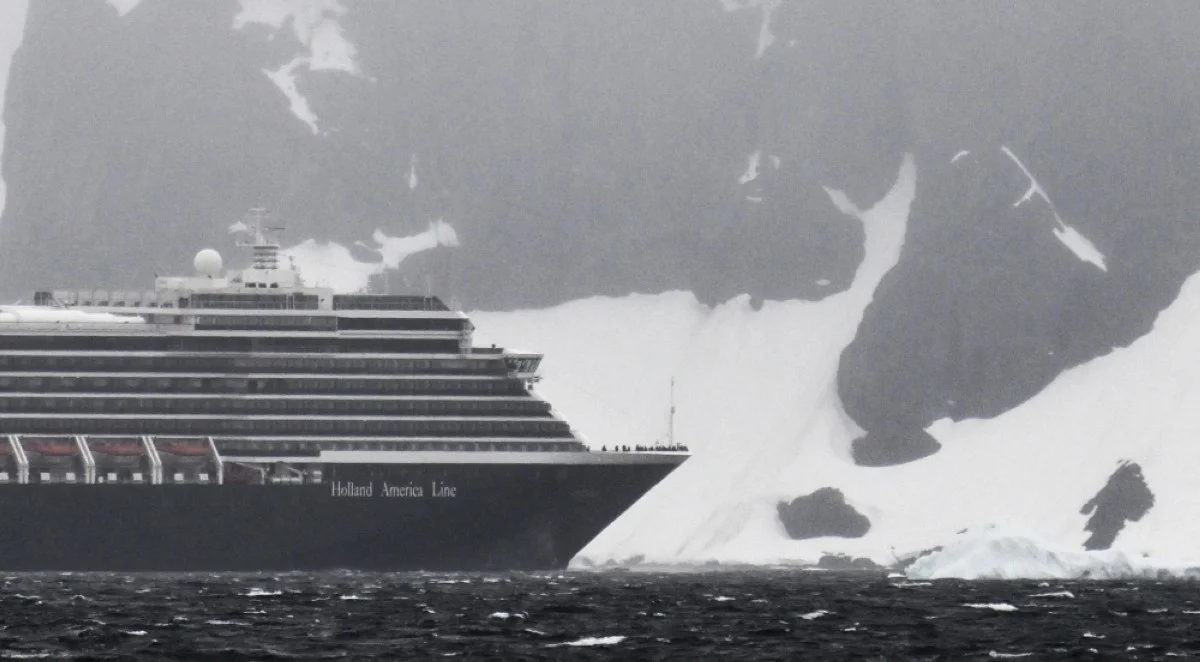 A cruise ship sails at the Gerlache Strait, which separates the Palmer Archipelago from the Antarctic Peninsula.