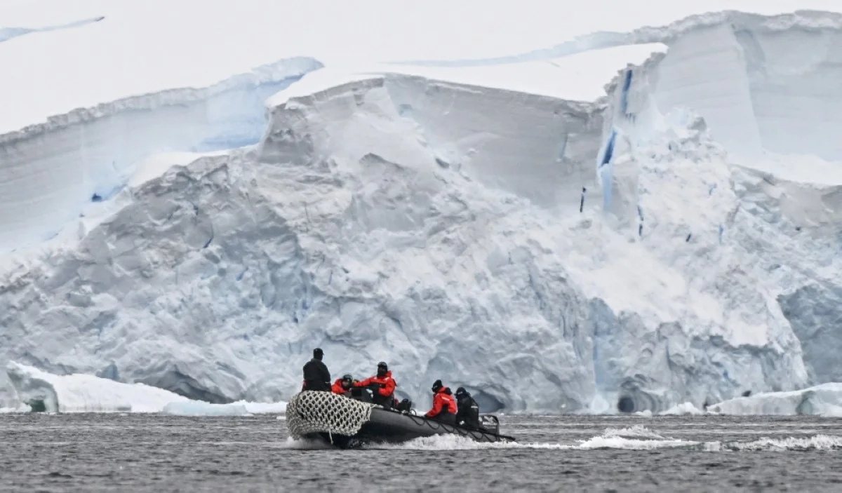 Crew members of the Colombian research vessel "ARC Simon Bolivar" ride a boat at the Gerlache Strait, which separates the Palmer Archipelago from the Antarctic Peninsula