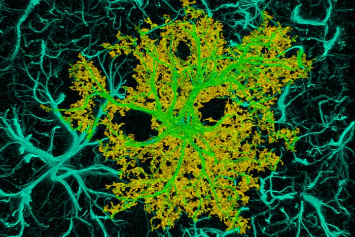 AN ASTROCYTE, A TYPE OF NON-NEURONAL CELL, IN THE RODENT CORTEX. THE OUTER BOUNDARY OF THE CELL IS SHOWN IN YELLOW; THE CELL “SKELETON” IN TEAL.