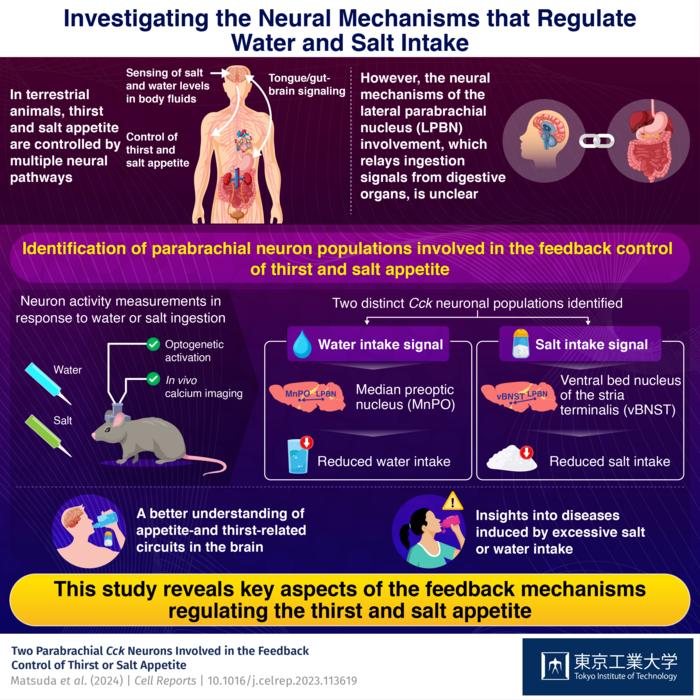 Therefore, these neuronal populations in the LPBN are involved in feedback mechanisms that reduce thirst and salt appetite upon water or salt ingestion, possibly helping prevent excessive water or salt intake. These results, alongside their previous neurological studies, also reveal that MnPO and vBNST are the control centers for thirst and salt appetite, integrating promotion and suppression signals from several other brain regions. “Understanding brain mechanisms controlling water and salt intake behaviors is not only a significant discovery in the fields of neuroscience and physiology, but also contributes valuable insights to understand the mechanisms underlying diseases induced by excessive water and salt intake, such as water intoxication, polydipsia, and salt-sensitive hypertension,” remarks Dr. Matsuda.