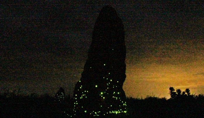 LUMINOUS TERMITE MOUND IN EMAS NATIONAL PARK, GOIÁS STATE: LARVAE OF CLICK BEETLE PYREARINUS TERMITILLUMINANS PRODUCE A SPECTACLE NOW CONFINED TO THE PARK, AN ISLAND IN AN OCEAN OF MONOCULTURE