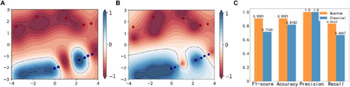 A. and B. Decision plane obtained by classical and quantum support vector machines for the same dataset. The color represents the value of the training data decision function and the black dotted line marks the decision boundary. Test set data are represented by circles. C. Comparison of the performance of quantum and classical classifiers on flow separation tasks.