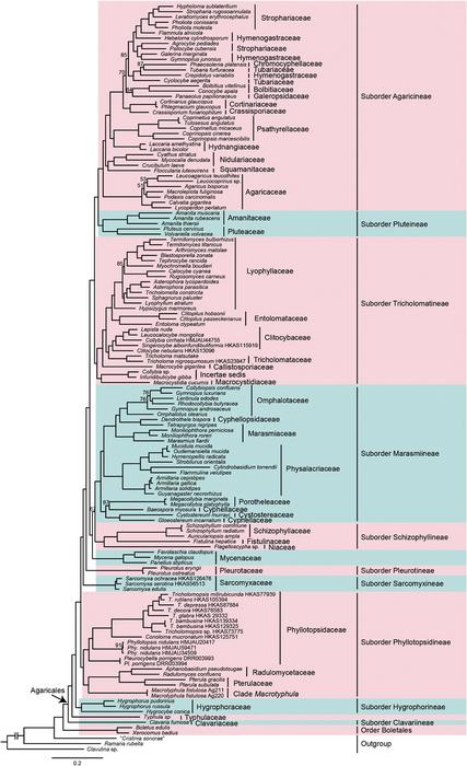 Previous studies divided Agaricales into 8 suborders and 46 families, but the systematic position and phylogenetic relationship of some genera and species were unclear. For example, genera Tricholomopsis and Sarcomyxa have been controversial for a long time.