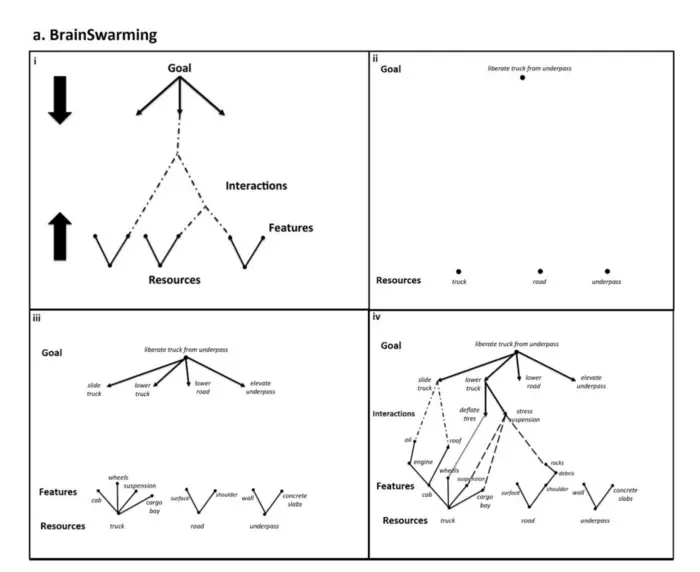 AN EXAMPLE OF BRAINSWARMING: BRAINSWARMING GRAPHS WERE DESIGNED AS A MEANS OF VISUALISING PROBLEM SOLVING AND FACILITATING SIMULTANEOUS IDEA GENERATION IN A PROBLEM-SOLVING. A SHORT DESCRIPTION OF THE PROBLEM TO BE SOLVED, IN THE CASE STUDY, THE GOAL IS PLACED AT THE TOP OF A TWO-DIMENSIONAL GRAPH ON ANY MEDIUM THAT ALLOWS ADAPTATION AND VISUALISATION, WITH THE AVAILABLE RESOURCES AT THE BOTTOM OF THE GRAPH. THE GOAL IS ITERATIVELY REFINED DOWNWARDS BY PLACING MORE DETAILED EXPRESSIONS OF THE SAME GOAL UNDERNEATH IT. FINALLY, A LINK IS THEN CREATED WHEN THE REFINED GOAL AND AVAILABLE RESOURCES ARE ABLE TO FORM A SOLUTION.