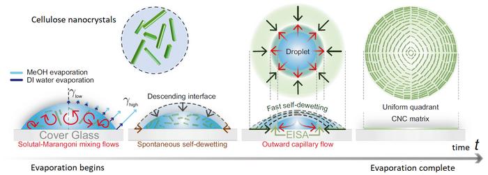 FIGURE 1. CONCEPTUAL IMAGE TO DISPLAY HYDRODYNAMIC MECHANISMS FOR THE FORMATION OF A HOMOGENEOUS QUADRANT CELLULOSE NANOCRYSTAL(CNC) MATRIX.