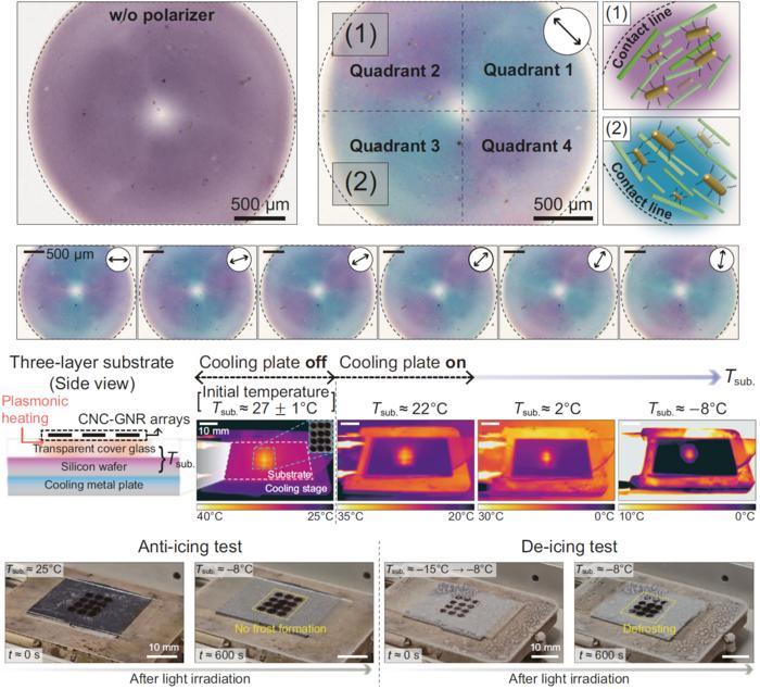 To solve this, the joint research team utilized cellulose nanocrystal (CNC), a next-generation functional nanomaterial that can easily be extracted from nature. By co-assembling GNR on CNC quadrant templates, the team could uniformly dry the film and successfully obtain a GNR film with a uniform alignment in a ring-shape. Compared to existing coffee-ring films, the highly uniform and aligned GNR film developed through this research showed enhanced plasmonic photothermal properties, and the team showed that it could carry out anti-icing and de-icing functions by simply irradiating light in the visible wavelength range.