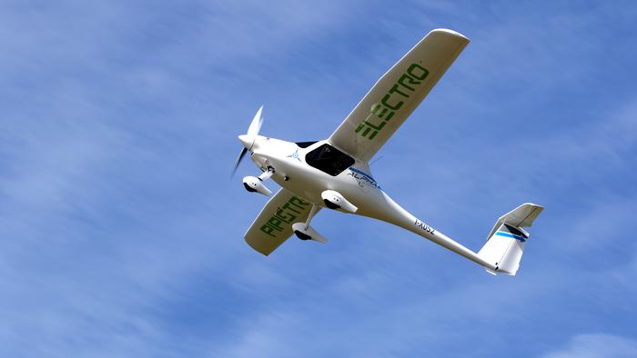 The electric aircraft in the study is a Pipistrel Alpha Electro manufactured in Slovenia. The wings have a span of just over 10 meters and the plane weighs 550 kg when fully loaded. Maximum flight time is about one hour, plus reserve. The battery is a 21 kWh NMC (nickel-manganese-cobalt) lithium-ion battery, and the motor produces an output of 60 kW. The Alpha Electro was a pre-series model and has been replaced by an evolved series-produced model.