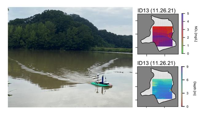 (LEFT) UNCREWED SURFACE VEHICLE OBSERVATIONS DEPICTING DEPTH AND NITRATE CONCENTRATIONS IN DALJEONJI RESERVOIR