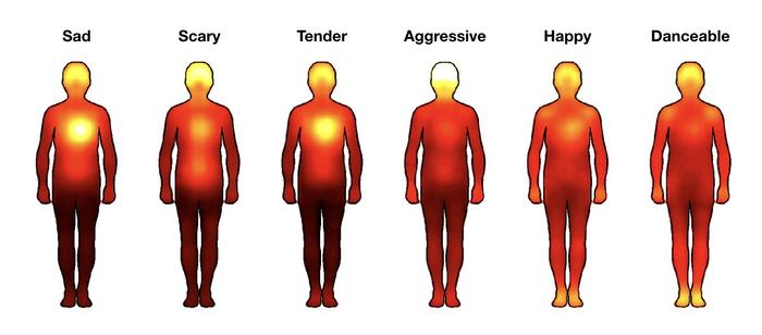 “Music that evoked different emotions, such as happiness, sadness or fear, caused different bodily sensations in our study. For example, happy and danceable music was felt in the arms and legs, while tender and sad music was felt in the chest area,” explains Academy Research Fellow Vesa Putkinen.