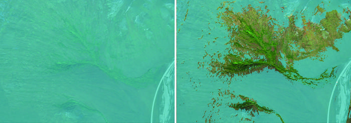 THE LEFT PANEL SHOWS THE NEAR-SURFACE PERMAFROST EXTENT (BLUISH AREA, OVERLAID ON SATELLITE IMAGERY) ESTIMATED BY THE MOST COMMONLY USED PAN-ARCTIC MAP PRODUCT FOR A SITE IN ALASKA. THE RIGHT PANEL SHOWS THE ESTIMATE FOR THE SAME SITE GENERATED BY A NEW ARTIFICIAL INTELLIGENCE MODEL DEVELOPED BY LOS ALAMOS NATIONAL LABORATORY. IN THE RIGHT PANEL, THE LACK OF BLUE OVERLAY WHERE THE SATELLITE IMAGERY IS CLEARLY VISIBLE INDICATES THERE IS NO PERMAFROST IN THOSE LOCATIONS. THIS MORE ACCURATE IMAGE WAS GENERATED BY A RANDOM-FOREST MACHINE LEARNING MODEL.