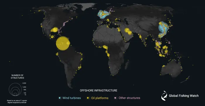 Two million gigabytes of satellite imagery were analyzed to detect offshore infrastructure in coastal waters across six continents where more than three-quarters of industrial activity is concentrated.