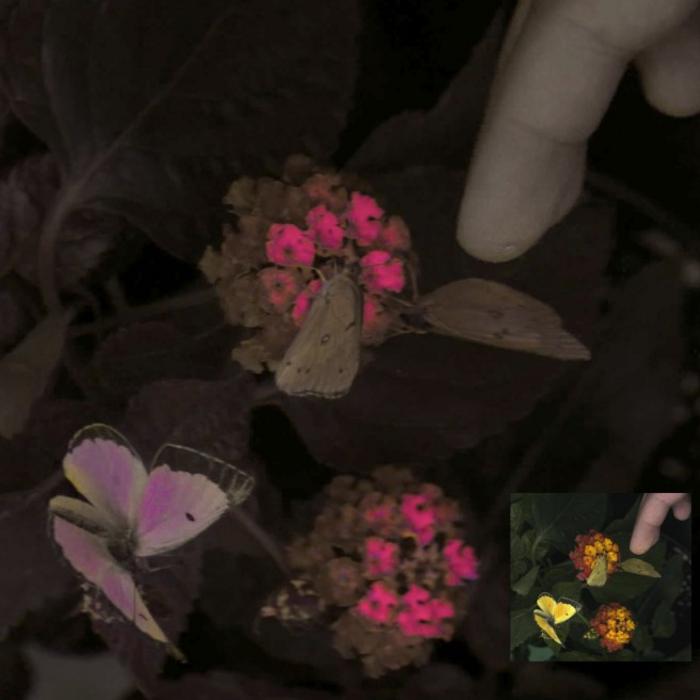 VASAS ET AL. (2024) UNVEIL A NEW CAMERA SYSTEM AND SOFTWARE PACKAGE THAT ALLOWS BOTH RESEARCHERS AND FILMMAKERS TO CAPTURE AND DISPLAY ANIMAL-VIEW VIDEOS. THIS IMAGE OF THREE MALE ORANGE SULPHURS COLIAS EURYTHEME IS AN EXAMPLE OF ONE SUCH DEPICTION.