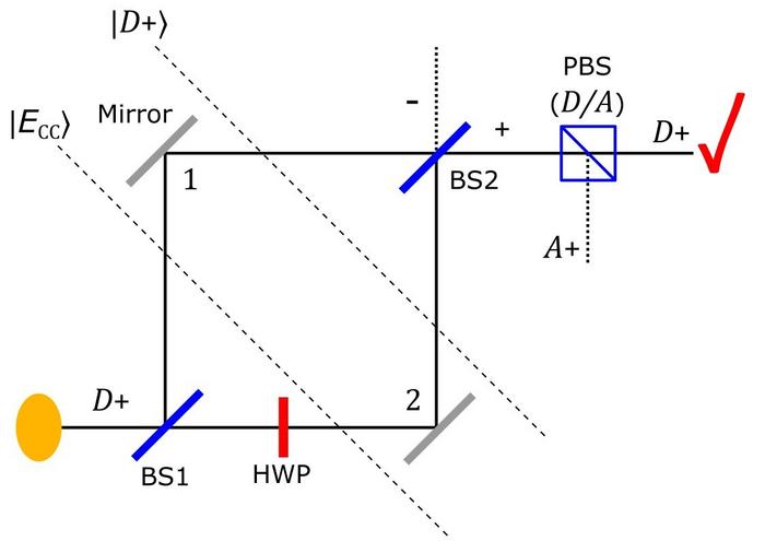 THE SIMPLE INTERFEROMETER USED IN THE QUANTUM CHESHIRE CAT SCENARIO, WHERE A PHOTON IS PREPARED IN THE PATH-POLARISATION ENTANGLED STATE ECC,BUT IS ONLY CONSIDERED IF IT ARRIVES ON OUTPUT PATH + WITH POLARISATION D. THE PARADOX ARISES WHEN WE CONSIDER THE PHOTON’S PATH, POLARISATION, AND PATH-POLARISATION CORRELATION, WHILE IT IS INSIDE THE INTERFEROMETER.
