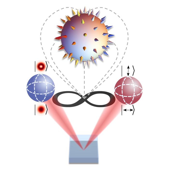CONCEPTUAL ILLUSTRATION OF THE ENTANGLED SKYRMION TOPOLOGY. EACH PHOTON CONTRIBUTES TO THE EMERGING TOPOLOGY THAT ONLY EXISTS AS A COMBINED ENTITY OF THE TWO PHOTONS.