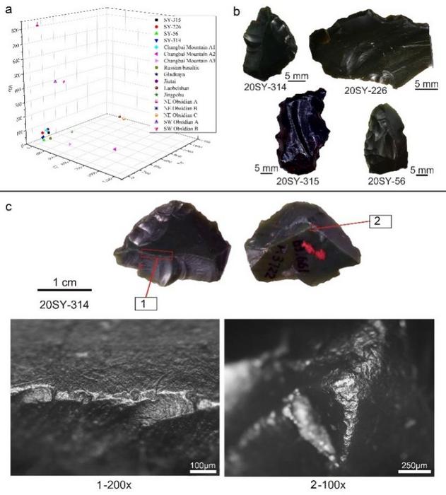 a) scatterplot of Rb, Sr, and Zr measurements for the Shiyu obsidian artefacts and obsidian sources across East Asia; b) the four obsidian lithics from Shiyu; c) SY20-314 endscraper on obsidian. 1–2, transport wear observed at 200x and 100x magnification