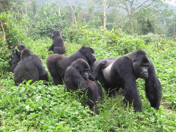 SILVERBACK KIGHOMA (CENTER) AND THE REST OF GRACE GORILLA GROUP WERE RESCUED FROM THE ILLEGAL WILDLIFE TRADE AND NOW RESIDE AT THE GORILLA REHABILITATION AND CONSERVATION EDUCATION CENTER (GRACE) SANCTUARY IN THE DEMOCRATIC REPUBLIC OF THE CONGO.
