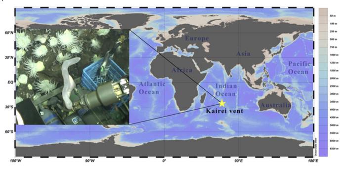 THE SAMPLING SITE FOR THE SEA CUCUMBER WAS AT THE KAIREI VENT FIELD AT THE BOTTOM OF INDIAN OCEAN. THE INSET SHOWS A PHOTO OF SAMPLING AT A DEPTH OF 2,428 M OF THE SEA CUCUMBER CHIRIDOTA HEHEVA USED FOR GENOME SEQUENCING.
