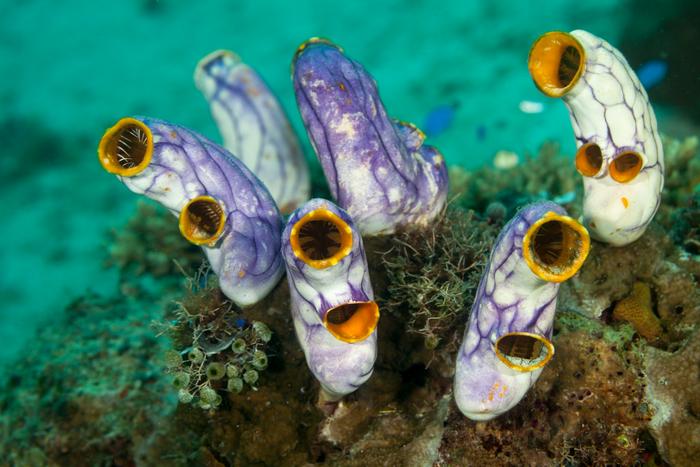 SEA SQUIRTS ATTACHED ON REEF. THE MARINE ORGANISM IS A GREAT MODEL TO STUDY DEVELOPMENTAL PROCESSES OF VERTEBRATES.