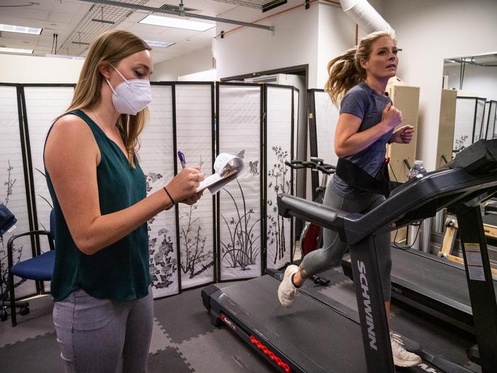 Boulder-based ultrarunner Heather Mashhoodi runs on the treadmill in 2021 as part of a study exploring how cannabis influences exercise. First author Laurel Gibson takes notes in the background. Study participants used cannabis on their own at home before being picked up and driven to the lab for testing. Credit: Patrick Campbell/CU Boulder