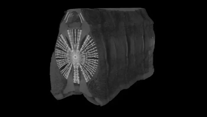 Researchers used micro-CT scanning, similar to CAT scans humans use in medical facilities, to image the internal architecture of each vertebra and quantified various mineral structures found in the calcified cartilage. They also used two-dimensional shape analysis techniques to examine variation in the spatial distribution of mineral structures along the vertebral column.