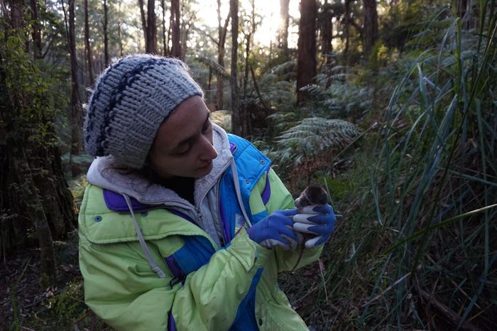 This photograph shows researcher E.Zaid holding a dusky antechinus before releasing it at the trapping site at the end of the breeding season.