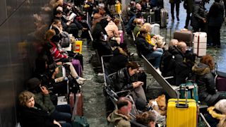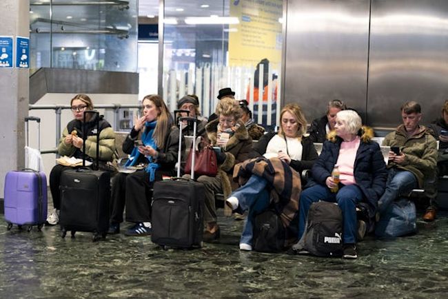 Passengers at London’s Euston station on Sunday following train delays as Storm Isha brought severe disruption to rail services