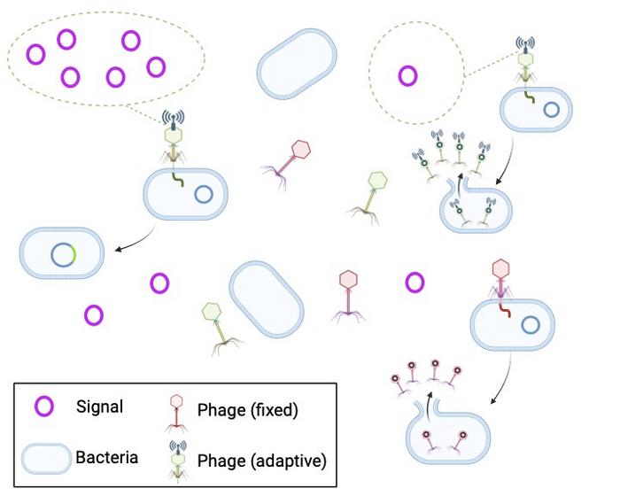 ILLUSTRATION OF THE COMPETITION EXPLORED IN THE PAPER, BETWEEN PHAGES WITH A FIXED BRANCHING RATIO BETWEEN LYSOGENY AND LYSIS (GREEN) AND PHAGES WHO ADJUST THIS RATIO BASED ON ENVIRONMENTAL INFORMATION (PINK). THE LATTER, WHEN INFECTING BACTERIA (BLUE) RELEASE SIGNAL MOLECULES (PURPLE), WHICH THEY CAN THEN DETECT TO OBTAIN INFORMATION ABOUT THE ENVIRONMENT.