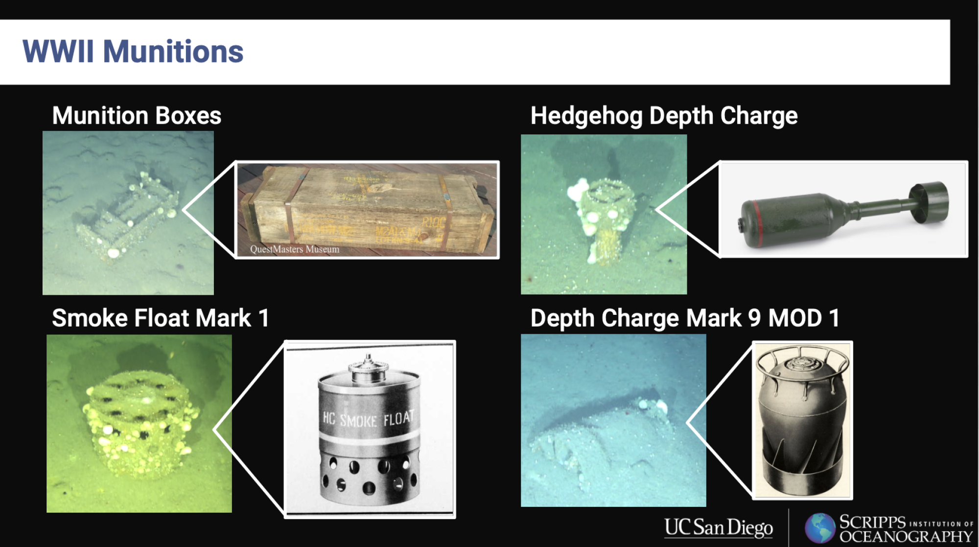 Scripps researchers were able to group most of the military waste that they found underwater into four general categories: munition boxes, smoke floats, and two types of WWII-era depth charges.