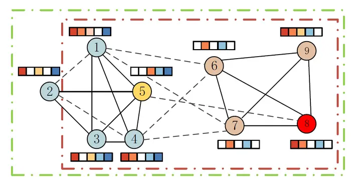 AN EXAMPLE OF THE POLARIZED COMMUNITIES IN AN ATTRIBUTED SIGNED NETWORK. SOLID EDGES ARE POSITIVE, WHILE DASHED EDGES ARE NEGATIVE. THE POLARIZED COMMUNITIES WHERE THE GREEN BOX IS LOCATED UTILIZE TOPOLOGY, WHILE THE POLARIZED COMMUNITIES WHERE THE RED BOX IS LOCATED CONSIDER BOTH TOPOLOGY AND ATTRIBUTE.