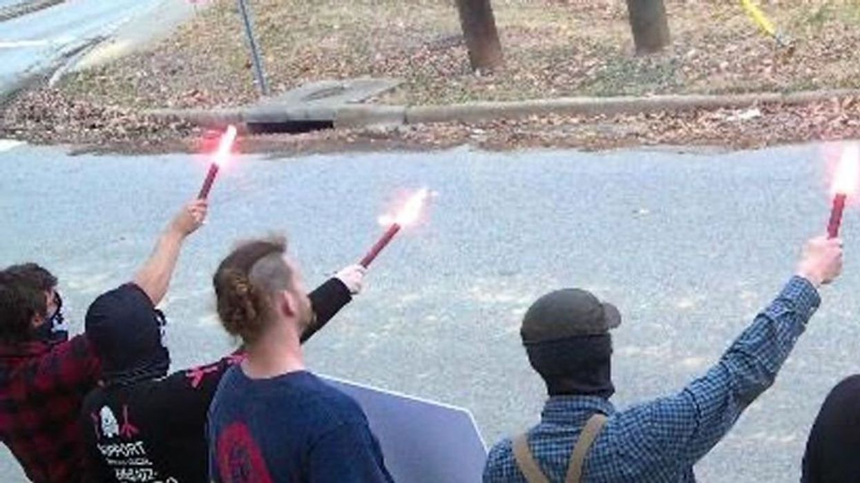 Six neo-Nazis — holding burning flares and raising their arms in Nazi salutes — demonstrated in front of author Jordan Green's home on Feb. 10, 2024. One held a sign threatening "consequences."