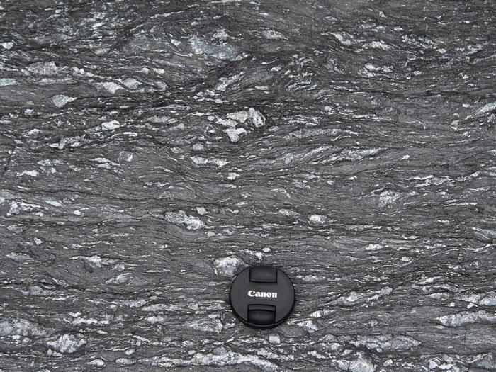 SHEARS — OR BREAKS CAUSED BY STRAIN — IN ROCK OUTCROPS LIKE THE ONE PICTURED HERE COULD SHED NEW LIGHT ON TECTONICS THAT OCCUR BETWEEN MAJOR EARTHQUAKES IN THE SUBDUCTION ZONE, ACCORDING TO NEW RESEARCH. A CAMERA LENS SHOWS THE SCALE OF THE FEATURES OF THE ROCK.