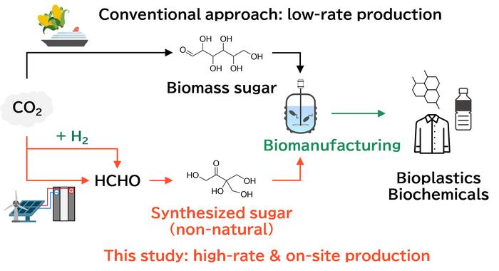 The results of this research have demonstrated that chemically synthesized sugar can be used as a new raw material for biomanufacturing. The use of chemically synthesized sugar, which can be produced at high rate and on-site, is expected to solve the problems of raw material supply in biomanufacturing, such as competition with food, regional dependence, and large-scale use of depletable resources, and is expected to be a game changer in this area.