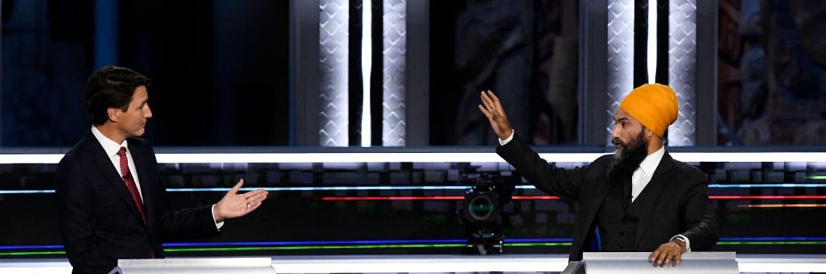 Liberal Canadian Prime Minister Justin Trudeau and New Democratic Party Leader Jagmeet Singh participate in a debate in Gatineau, Quebec, Canada on September 9, 2021.