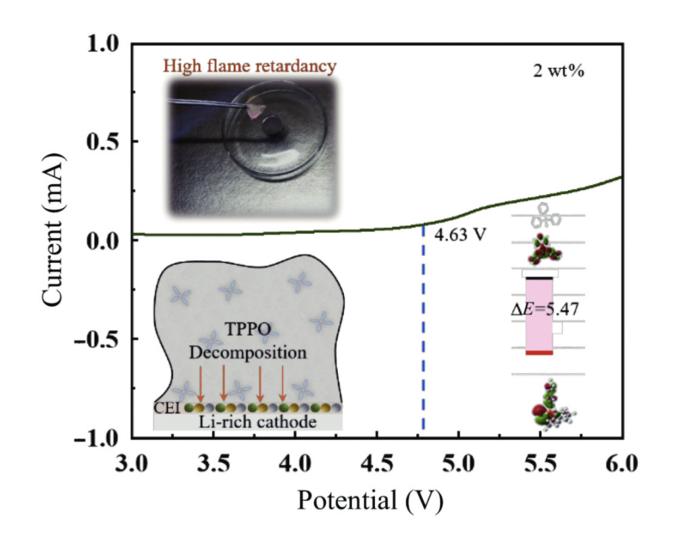 THE INCREASED OXIDATIVE DECOMPOSITION POTENTIAL IS IN EVIDENCE AT 4.63 V ALLOWING THE POTENTIAL FORMATION OF A PASSIVATION LAYER. THE ILLUSTRATIONS SHOW THE THREE MOST CRITICAL FINDINGS SUMMARIZED; A HIGH FLAME RETARDANCY (UPPER LEFT CORNER), THE CREATION OF A PASSIVATION LAYER ON THE CATHODE AS TPPO DECOMPOSES (LOWER LEFT CORNER) AND A REPRESENTATION OF THE STRUCTURAL AND MOLECULAR ORBITAL ENERGY OF TPPO THAT WAS USED TO PREDICT THE ADDITIVE’S ABILITY TO FORM A PASSIVATION LAYER (LOWER RIGHT CORNER).