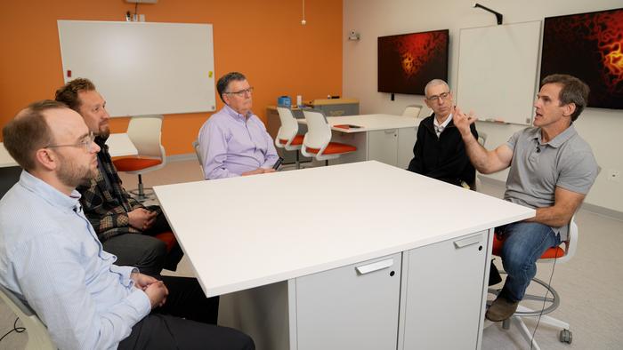 Scientists discuss their work to discover insights into the complexities of the brain and mind. Recently, the researchers, including (from left) Dan Bang of Aarhus University in Denmark, Ken Kishida of Wake Forest University School of Medicine, Michael Friedlander, executive director of the Fralin Biomedical Research Institute; Peter Dayan, managing director of the Max Planck Institute for Biological Cybernetics in Tübingen, Germany, and Read Montague, director of the Fralin Biomedical Research Institute Center for Human Neuroscience Research, reflected on achievements that have spanned decades.