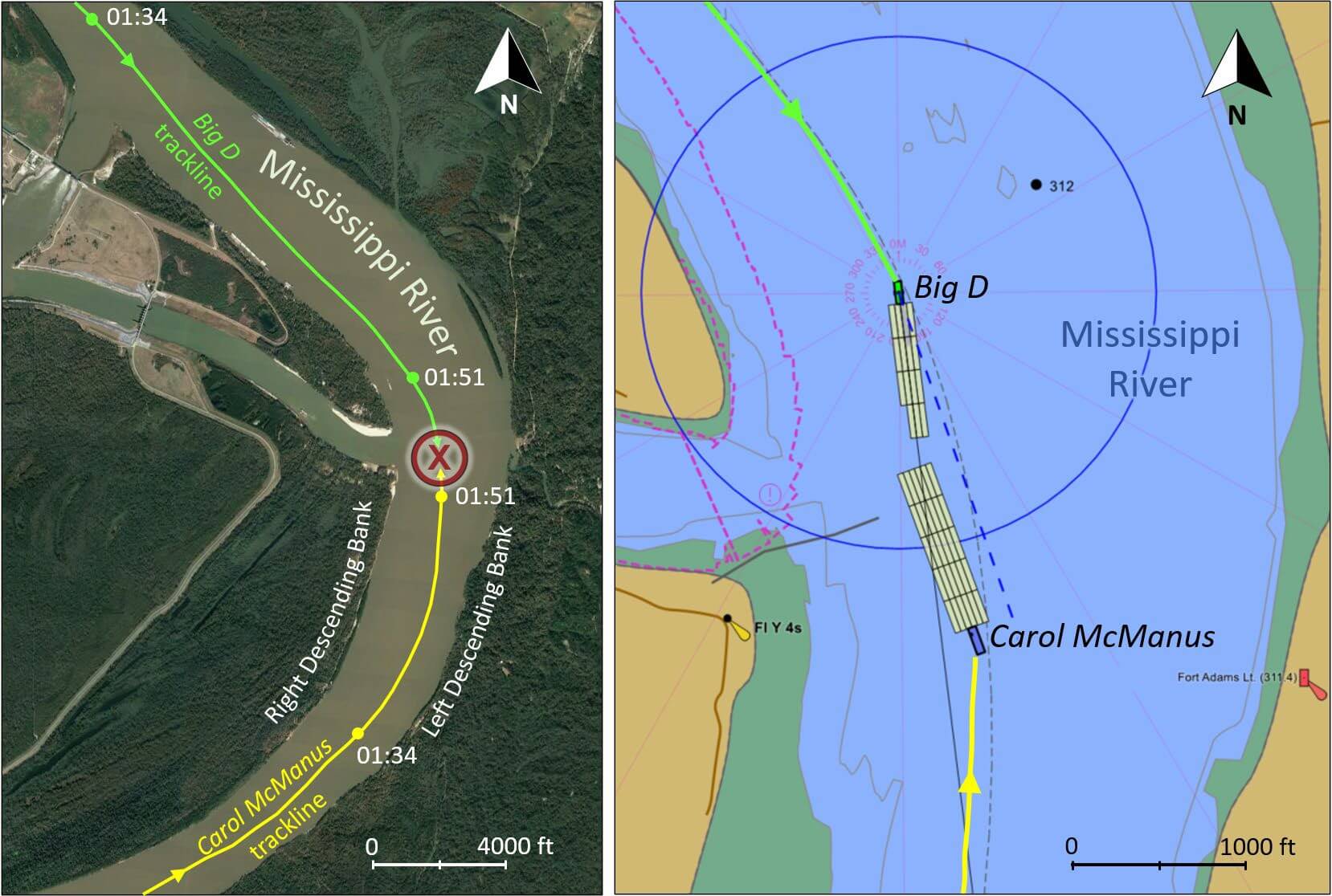 As they proceeded towards the bend, both towboats took a course along the right descending bank. The Big D's pilot noticed that something was wrong as his tow approached the bend: AIS showed that the Carol McManus was coming towards him, and so did the McManus' lights.