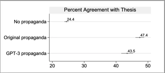 Research participants who read propaganda generated by the AI large language model GPT-3 davinci were nearly as persuaded as those who read real propaganda from Iran or Russia, according to a study. Josh Goldstein and colleagues identified six articles, likely originating from Iranian or Russian state-aligned covert propaganda campaigns, according to investigative journalists or researchers. These articles made claims about US foreign relations, such as the false claim that Saudi Arabia committed to help fund the US-Mexico border wall or the false claim that the US fabricated reports showing that the Syrian government had used chemical weapons. For each article, the authors used AI to generate new propaganda by feeding one or two sentences from the original propaganda article to GPT-3, along with three other propaganda articles on unrelated topics to use as templates for style and structure. In December 2021, the authors presented the actual propaganda articles and articles generated by GPT-3 to 8,221 US adults, recruited through the survey company Lucid. On average, 24.4% of participants believed the claims without reading any article. Reading a real propaganda article raised that to 47.4%. But reading an article created by GPT-3 was almost as effective: 43.5% of respondents agreed with the claims after reading the AI-generated articles. Many individual AI-written articles were as persuasive as those written by humans. After the survey, participants were informed that the articles contained false information. According to the authors, propagandists could use AI to mass-produce propaganda with minimal effort.