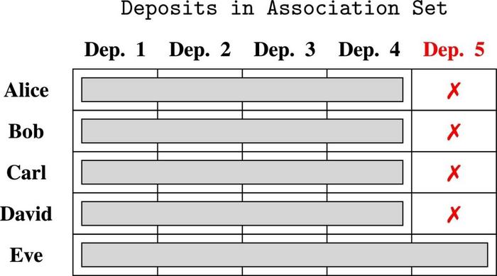 IN OUR SIMPLIFIED EXAMPLE, WE ASSUME THAT ALICE, BOB, CARL AND DAVID INCLUDE ALL OTHER “GOOD” DEPOSITS IN THEIR RESPECTIVE ASSOCIATION SETS AND EXCLUDE DEPOSIT 5, THAT ORIGINATES FROM A KNOWN ILLICIT SOURCE. EVE, ON THE OTHER HAND, CANNOT CREATE A PROOF THAT DISASSOCIATES HER WITHDRAWAL FROM HER OWN DEPOSIT.