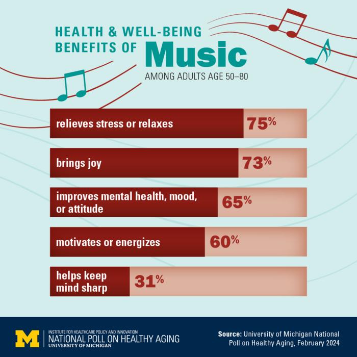 Three-quarters of people age 50 to 80 say music helps them relieve stress or relax and 65% say it helps their mental health or mood, according to the new results from the University of Michigan National Poll on Healthy Aging. Meanwhile, 60% say they get energized or motivated by music.