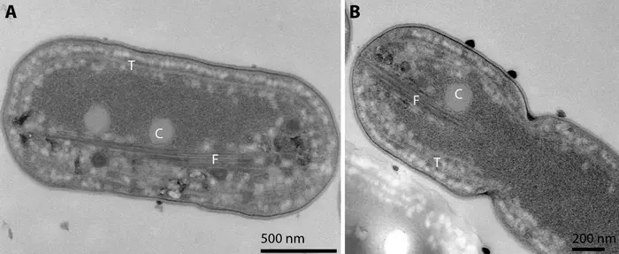 CYANOBACTERIA WITH PROTEIN FIBRES SEEN THROUGH A MICROSCOPE. THE PROTEIN FIBRES ARE MARKED 'F'.