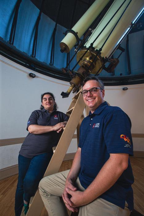 UNIVERSITY OF CINCINNATI GRADUATE STUDENT ANDREA CORPOLONGO, LEFT, AND ASSOCIATE PROFESSOR ANDY CZAJA POSE IN FRONT OF A TELESCOPE AT THE CINCINNATI OBSERVATORY. THEY SERVE ON THE NASA SCIENCE TEAM EXPLORING MARS WITH THE PERSEVERANCE ROVER.