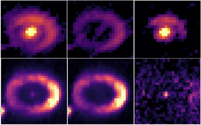 Fig. 3. Upper row. Left. Argon II image with MIRI/MRS at the velocity of the compact object. Middle: Corresponding image at ring speed. Right: The first image subtracted with the second image, showing how the compact object dominates the center. Bottom row: Same thing though for highly ionized argon with the NIRSpec instrument.