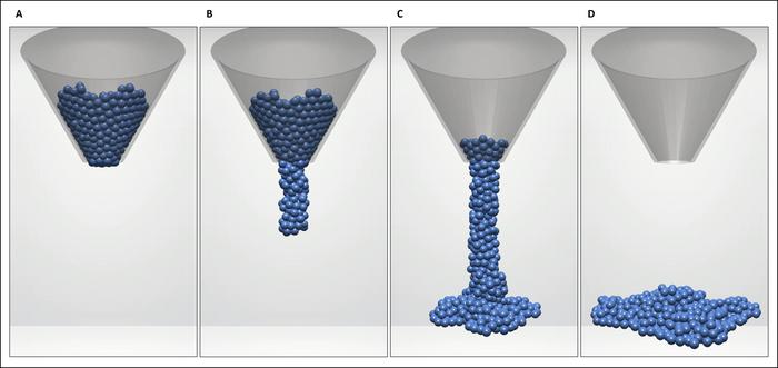 SMALL FUNNEL FLOW - THE SAME EXPERIMENTS WERE SET UP IN, BOTH, SIMULATION AND REALITY TO SEE IF THE VIRTUAL REGOLITH BEHAVED REALISTICALLY. THIS TEST LOOKED AT HOW SMALL (16 G) SAMPLES OF MATERIAL FLOWED THROUGH NARROW FUNNELS.