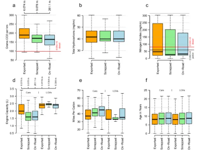 POLLUTION GENERATED PER KILOMETRE BY USED VEHICLE FLEETS. EXPORTED CARS (ORANGE) GENERATE AT LEAST 13-24% MORE CO2 PER KILOMETRE (A), SIMILAR AVERAGE BUT (THROUGH OVERDISPERSION) HIGHER MEDIAN FINE PARTICULATE MATTER POLLUTION (B), AND (C) AT LEAST 53% MORE NITROGEN OXIDES PER KILOMETRE THAN SCRAPPED (GREEN) OR ON-ROAD (BLUE) VEHICLE FLEETS. BOTH EXPORTED CAR AND LGVS FLEETS ALSO HAVE LARGER OBSERVED ENGINE CAPACITIES (D) AND WORSE FUEL EFFICIENCY (E) DESPITE BEING SIMILAR AGES TO ON-ROAD FLEETS AND MUCH YOUNGER THAN CONTEMPORARY SCRAPPED VEHICLES (F). BOXES SHOW INTERQUARTILE RANGE (IQR), WHISKERS ARE 1.5X IQR, SAMPLE SIZE (MILLIONS) ON UPPERMOST X-AXES, SUMMARY DATA SUPPLIED IN FIGSHARE REPOSITORY.