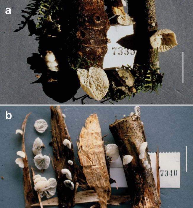 METACAMPANELLA DENDROPHORA. BASIDIOMATA, HABIT. (A) TFB 7335 (TENN-F-054395). (B) TFB 7340 (TENN-F-054442). STANDARD BARS = 10 MM.