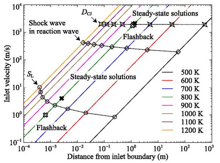 THE RELATIONSHIPS BETWEEN DISTANCE FROM INLET BOUNDARY AND INLET VELOCITY FOR STOICHIOMETRIC METHANE-AIR MIXTURES. THE OPEN CIRCLE-SHAPED MARKERS MEAN THAT THE INLET VELOCITY IS THE SAME WITH THE VELOCITY OF THE DEFLAGRATION WAVE. THE OPEN STAR-SHAPED MARKERS MEAN THAT THE INLET VELOCITY IS THE SAME WITH THE VELOCITY OF THE DETONATION WAVE. THE OPEN DIAMOND-SHAPED MARKERS MEAN THAT THE VELOCITY CAN EXCEED THE SPEED OF SOUND WITHIN THE REACTION WAVE WHEN THE INLET VELOCITY IS SUBSONIC.